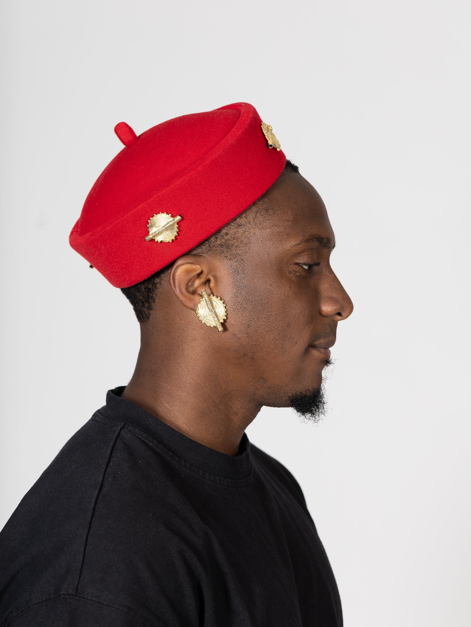 This hat is entirely handmade in our workshop in Abidjan (Ivory Coast). The base of the hat is made of felt and is decorated with bronze Baoulé weights (Akan weights). It is worn like a beret.